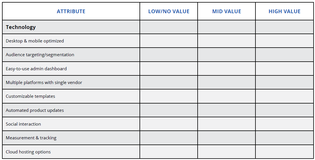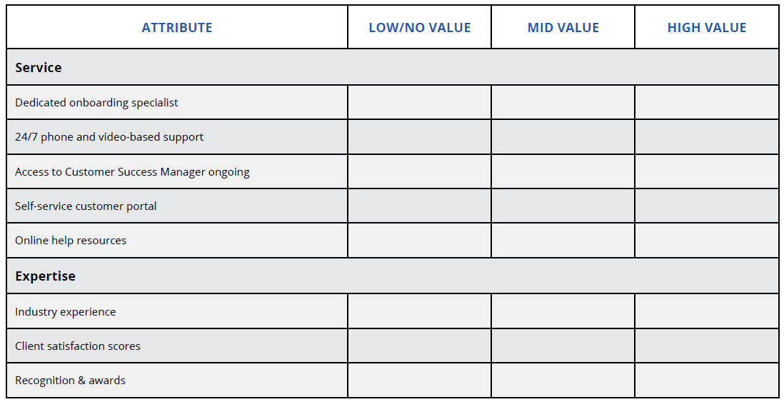 A range of different attributes are grouped into categories for Technology, Service and Expertise. Columns represent different levels of value, from Low/No Value to Mid Value through to High Value.